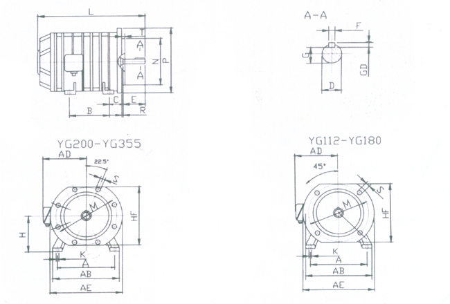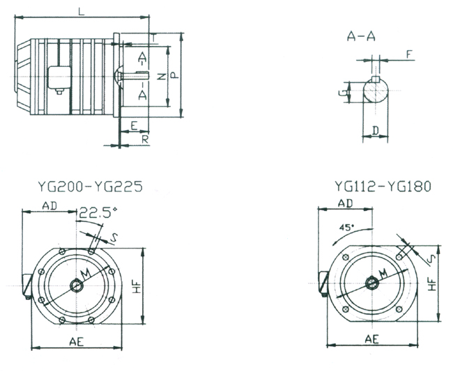 YG系列電動機安裝尺寸符合IEC標(biāo)準(zhǔn),外殼防護等級為IP54,冷卻方式為IC0041,額定電壓380V,額定功率為50Hz,H級絕緣、定子繞組采用Y接法。